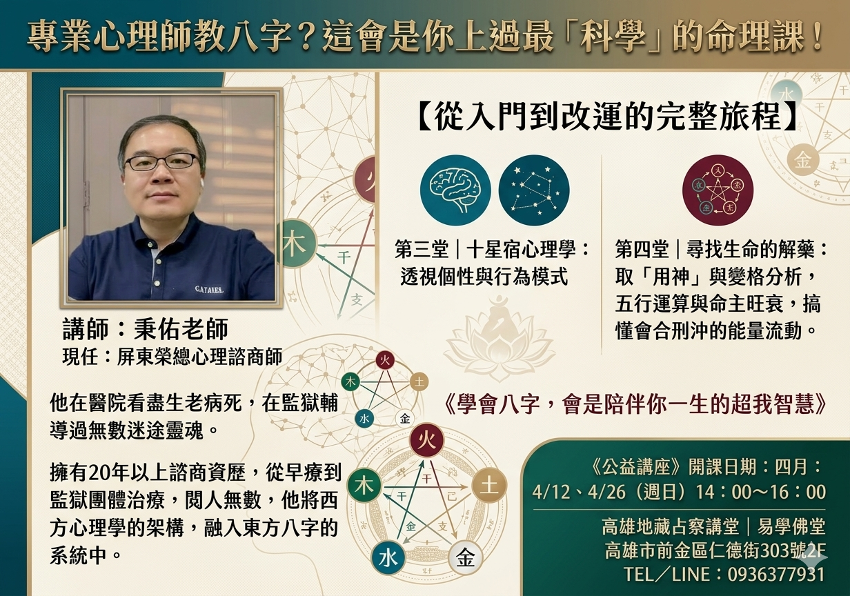 高雄佛堂|4月公益講座八字初中階|專業心理師|八字心理學。搞懂你的原廠設定(第三堂。第四堂)